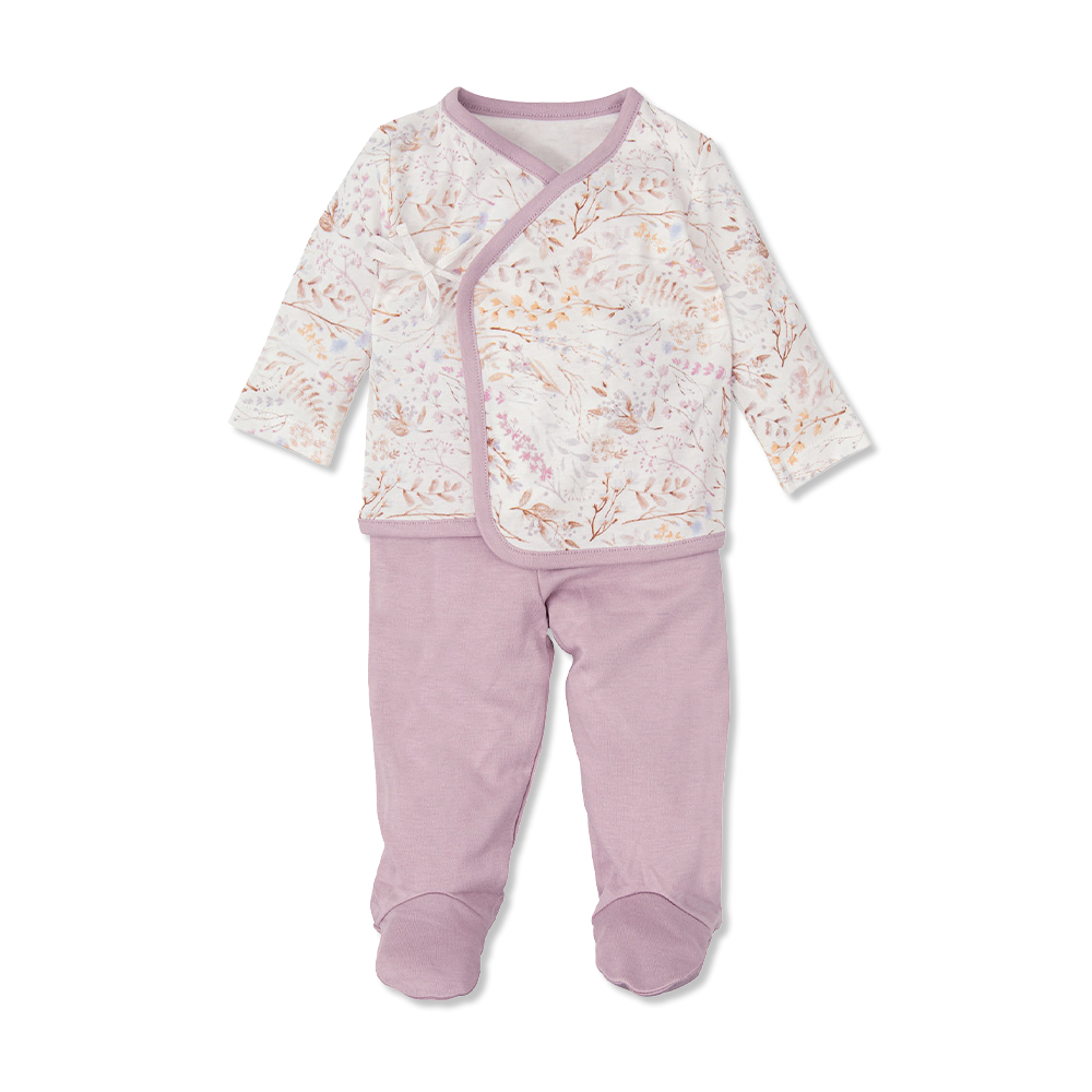 內含一件柔軟親膚的上衣,還有一件與上衣顏色相呼應的包腳長褲,適合1~3個月的寶寶著用。