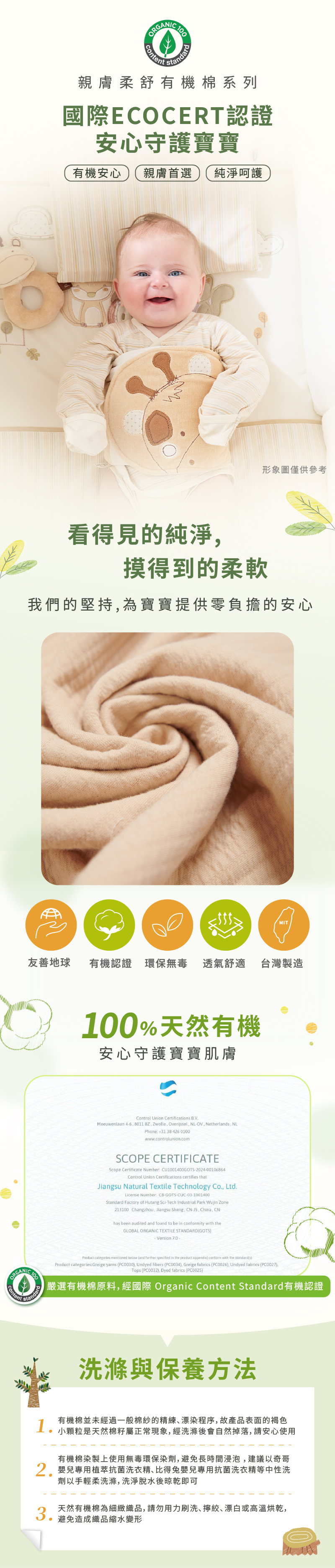 不含農藥、不經化學處理,全程通過ECOCERT有機認證,守護寶寶肌膚,也守護地球環境。