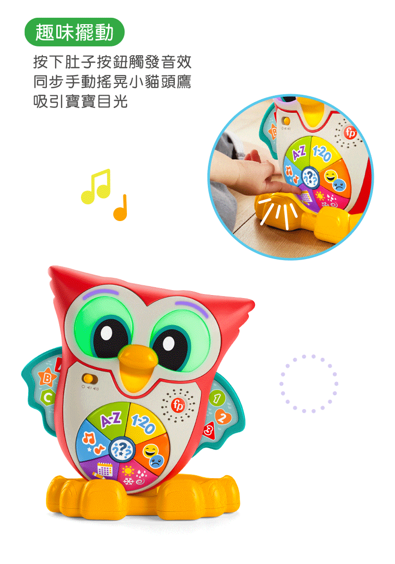 1.寶寶可以按下費雪LINKIMALS聲光學習小貓頭鷹肚子按鈕觸發音效,同步手動搖晃小貓頭鷹,吸引寶寶目光。