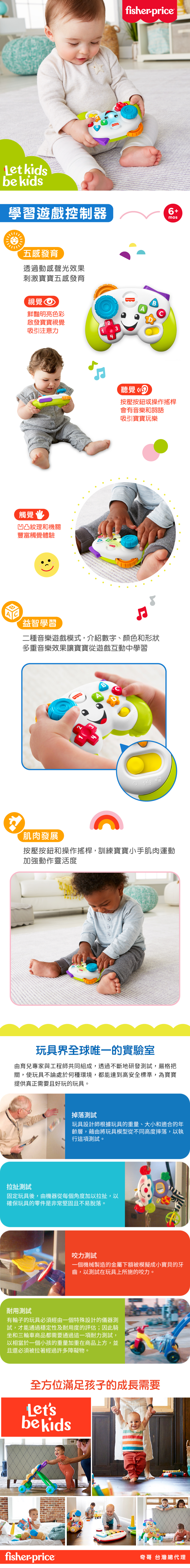 費雪學習遊戲控制器有如遊戲機的外型,有2種學習模式,加上融合趣味音效的各種小遊戲,讓寶寶在充滿刺激的活潑音樂中學習認知英文、形狀、顏色和數字,在玩樂中無形學習!擁有可愛大眼睛的控制器,一定會是寶寶學習的好夥伴!