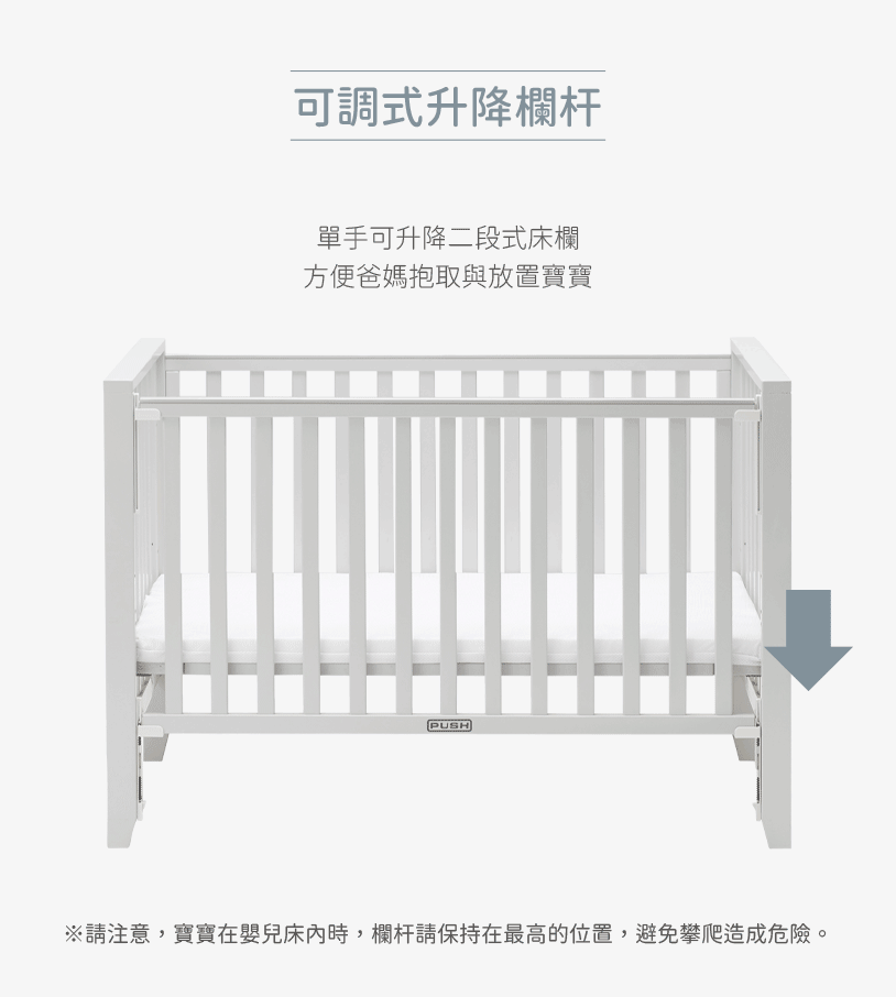 8.當嬰兒能抓住站立時,床板最上端至上橫桿之高度須調整至少60公分以上。