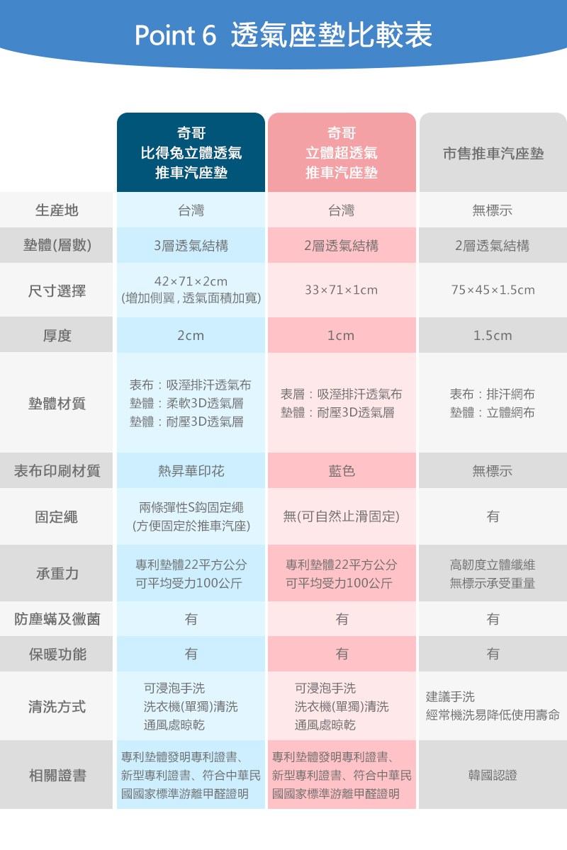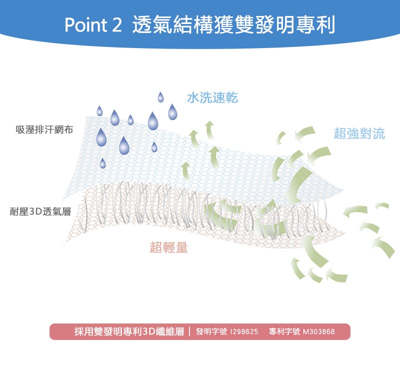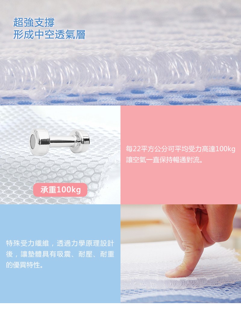 採100%特殊受力聚酯纖維,以力學原理設計之立體氣孔,承受重量後,空氣於墊體內依然暢通對流,