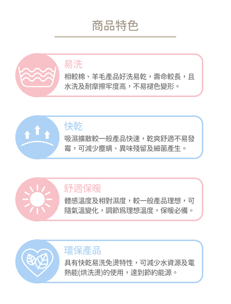 2.易洗:本產品較棉、羊毛產品好洗易乾,不易起毛球,尺寸安定性高,纖維抱合力較天然纖維強,產品壽命較長。
