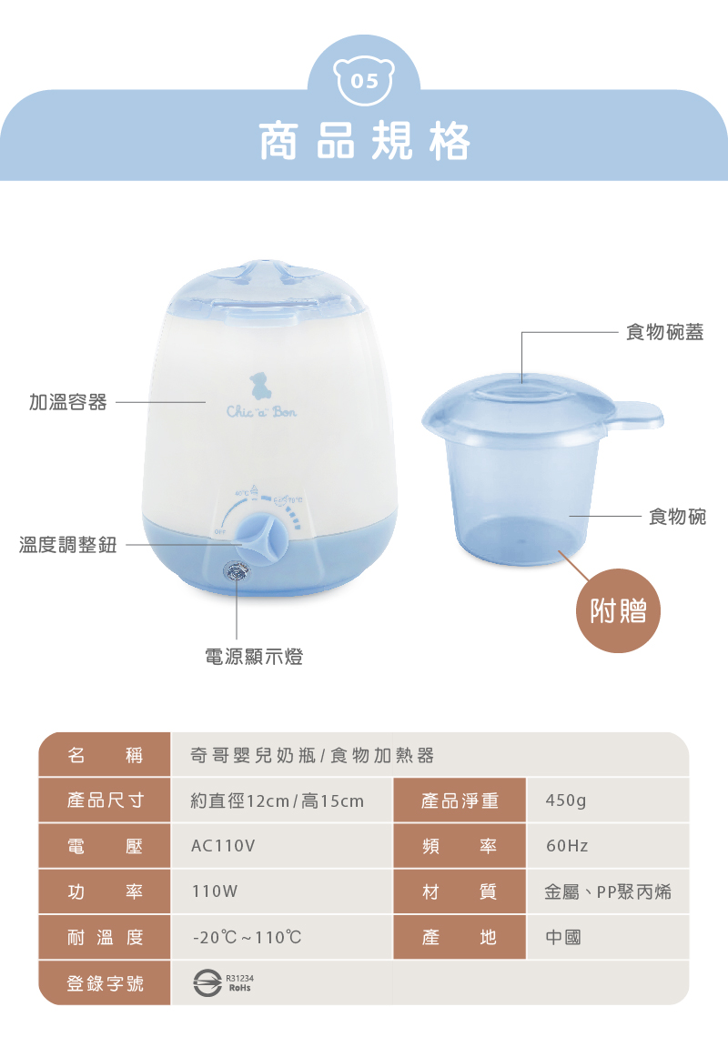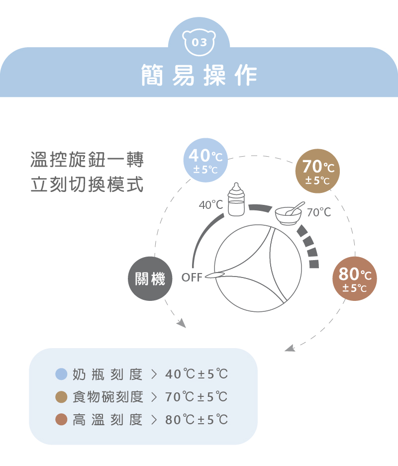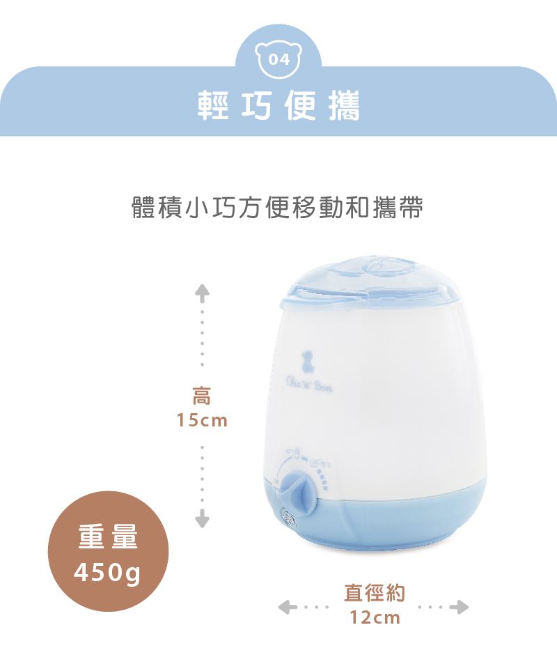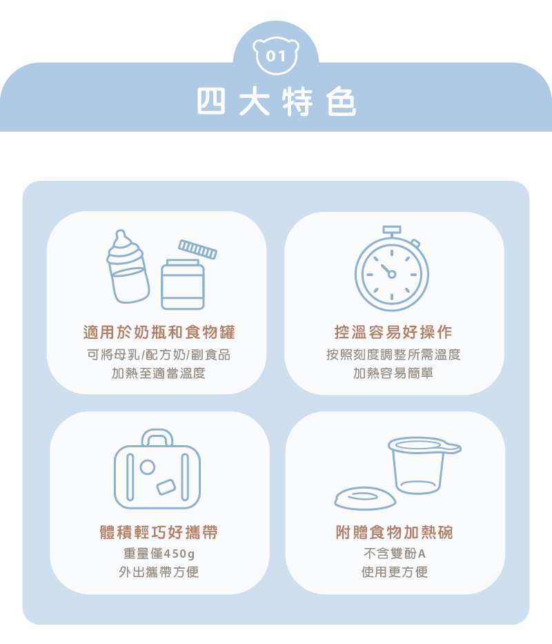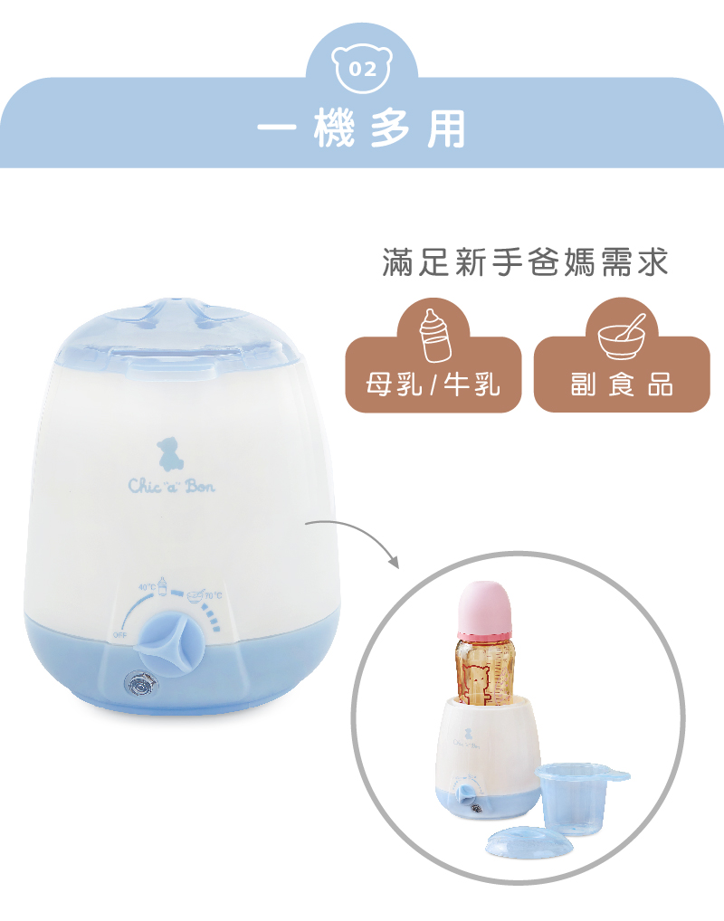 ● 多功能設計:3種使用模式,可準確控制溫度,快速加熱母乳、牛乳及副食品。
